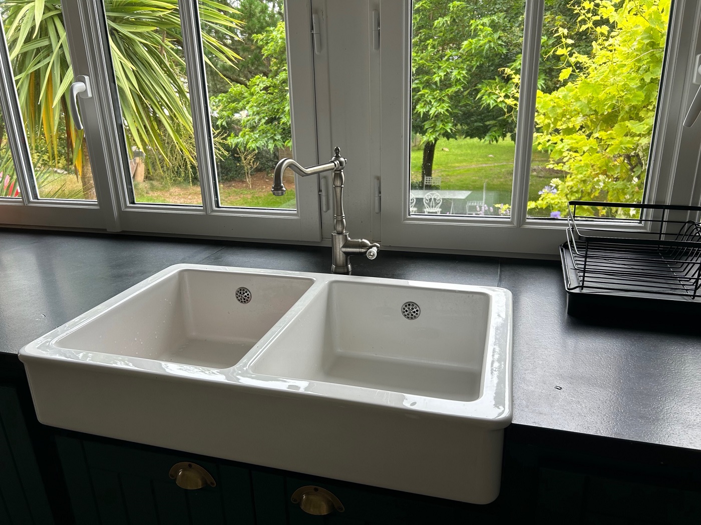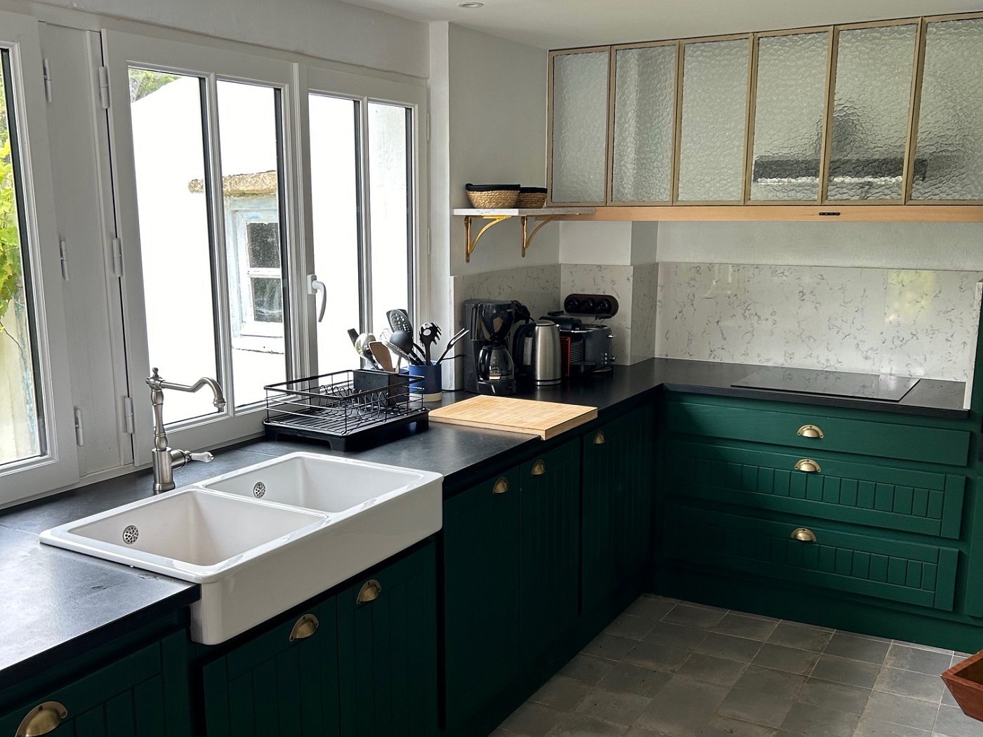 • Küche mit Kochplatten, Backofen, Kühlschrank, Gefrierschrank, Toaster, Wasserkocher, Kaffeemaschine, Nespresso-Kaffeemaschine, Kochtöpfe, Geschirrspüler, Waschmaschine